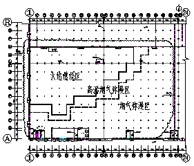 該建筑為2層現澆混凝土框架結構,鋼結構屋面,東西方向長411.3m,南北方向寬143.5m,一層層高7m,二層層高6.5m,主體結構高13.7m,軸網尺寸為7mx7.5m、7mx7.7m、7mx7.75m。該建筑東西向共設有5道伸縮縫、南北向共設有1道伸縮縫,根據伸縮縫設置位置,共分12個區,本次著火區域及煙氣彌漫區域為1~11軸/A~K軸、12~22軸/A~K軸、1~11軸/L~V軸、12~22軸/L~V軸區域,火災區域平面布置見圖1。
