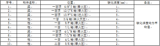 受火災影響的混凝土碳化深度,火焰燃燒區平均為4mm,煙氣彌漫區域構件混凝土因未受明顯影響,且該混凝土為近期施工,其碳化深度平均為0~4mm左右。