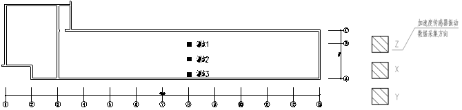 根據本次測試方案在辦公樓屋面中央(五層)采用了以下測點布置方式(測點布置見圖1,每個測點的傳感器布置情況見圖2所示),三個測點同時進行,每個測點分別采用X、Y、Z向單向加速度傳感器,連續采集結構振動加速度時程。