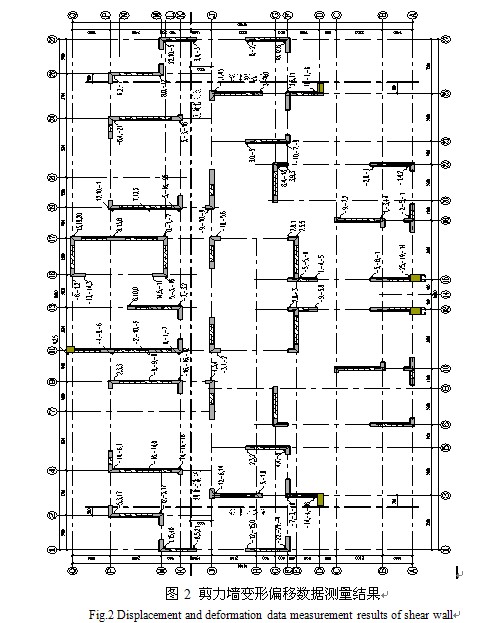 根據現場初步測量的實際數據,經與業主方、管理方、監理方和設計方多方溝通,確定本次檢測工作的主要內容,除了常規鑒定評估檢測項目所需的必要的測量、測試檢查之外,重點檢測工作內容是調查、了解房屋設計、施工等的相關資料和過程,對資料進行分析和判斷,分析出現此種工程質量事故的原因。重點檢測工作內容是根據測量控制線復核各層軸線定位尺寸,為后續上層結構施工提供依據。重點檢測工作內容是對負二層至八層施工完畢的剪力墻構件進行定位偏差、垂直度以及平整度測量,以確定剪力墻的變形偏移方向和程度。