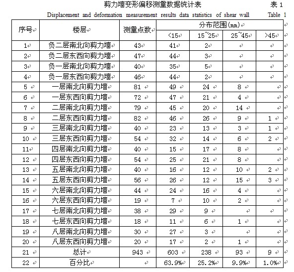 百分比為63.9%,剪力墻中心線相對于原設計軸線偏移在20±5mm的數據所占百分比為25.2%,剪力墻中心線相對于原設計軸線偏移在35±10mm的數據所占百分比為9.9%,剪力墻中心線相對于原設計軸線偏移大于45mm的數據所占百分比為1.0%。各樓層檢測數據分布詳見表1。