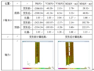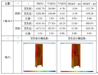 建模計算時考慮構件的偏移、變形,經驗算分析,房屋整體結構的彈性變形滿足規范要求。計算結果部分構件的內力對比數據見圖3。